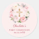 A soft blush pink background, decorated with watercolored pink and ivory flowers in a wreath and a golden cross. Personalize and add the name and date.