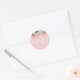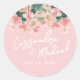 This wedding sticker features painted artwork of a desert florals on a pink background with the bride and groom's name in white.