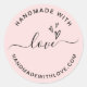 Pegatinas redondos con corazones, el texto "hecho a mano con amor" y la URL de tu sitio web en un fondo rosa claro. La palabra "amor" está escrita en un elegante tipo de letra de guión de caligrafía. Utilizar como sellos para sobres, pegatinas para regalos y favores, embalaje de productos, etc. Síguenos para más productos.