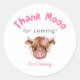 La fiesta de cumpleaños del chica de la temática rústica de las vacas favorece al pegatina con un ilustracion acuarela de una vaca de montaña con una flor rosa. El texto dice "¡gracias mooo por venir!"