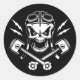 Calavera loca y pistones cruzados, con casco de cuero, gafas y pernos relámpago. Dibujo original de tinta B/W.