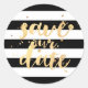 Los PixDezines guardan nuestra fecha, deslumbrado guión de moda y oro fino con manchas de tinta sobre rayas blancas y negras color de fondo DIY. com. Todos Los Derechos Reservados.