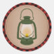 Un pegatina con un ilustracion de una lámpara verde de camping. El fondo es el material de la carta inspirado en la yegua roja y negra.