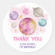 Este pegatina redondo mágico presenta planetas imaginarios, luna y estrellas de color rosa, púrpura y dorado.