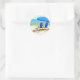 Pegatina Redonda Playa, paraguas y sillas en la orilla