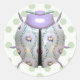 Una mariquita morada decorada con flores y encajes sobre un fondo de polka blanco y verde claro.