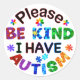 Los mensajes de "Please Be Kind I Have AUTISM" ("Por favor sé amable, tengo AUTISMO") muestran orgullo autista y sensibilizan sobre los trastornos del espectro autista y fomentan la bondad hacia ellos.