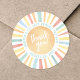 Este diseño pegatina redondo presenta un sol vibrante en el centro, con la alegre frase "¡Gracias!" colocada en la parte superior. Los rayos del sol brillan en una colorida mezcla de amarillo, naranja, rojo, verde azulado y azul, añadiendo un toque luminoso y alegre a tu primer viaje alrededor de la celebración del primer cumpleaños del Sol. Al rodear el sol, "First Trip Around The Sun" y la fecha de cumpleaños se colocan elegantemente en texto azul verde azulado alrededor del borde, creando un diseño impecable y personalizado. Este pegatina es una perfecta adición a los favores, regalos de agradecimiento o decoraciones, uniendo a tu fiesta con temática solar de manera hermosa. Personalizable completo, puede actualizar la fecha para que coincida con los detalles de la celebración. ¡Una manera dulce y atenta de apreciar a sus huéspedes!