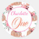 Cute otoño rosa floral fondo de calabaza primer cumpleaños pegatina redondo clásico con tu nombre personalizado en un guión de bonito rosa y la palabra "Uno" en un elegante guión naranja. Puede añadir fácilmente el nombre de su elección y cambiar el color y el tipo de letra utilizando la opción personalizar.