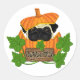 Calabaza en una vid con un lindo perro Pug dentro de la Calabaza. Una señal de madera en el parche de la calabaza dice Pugkin Patch. Cables artículos de Halloween, ropa, invitaciones de Halloween, bolsos de Trick o Treat y más para los amantes de Pug!