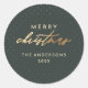 Difunde la alegría navideña con nuestra Pegatina Festiva. Un fondo verde oscuro con puntos dorados de lámina dorada falsa establece el escenario para "Merry" en tipografía sans-serif clásica y "Christmas" en elegante letra script. Personalízala aún más con el nombre de tu familia y el año. Perfecta para sellar sobres o añadir un toque de elegancia a tus regalos de Navidad.