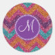 Pegatina Redonda Purpurina de monograma Chevron Naranja púrpura ros