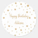 Purpurina Gold Star Feliz Cumpleaños Pegatina de Ronda Clásica. El sencillo pegatina de cumpleaños dorado es una moderna moda de niñera y tiene un brillo purpurina dorado. Se trata de un diseño minimalista sencillo y moderno. Las estrellas brillantes amarillas blancas son de diseño dorado. Suministros fiestas personalizados para cumpleaños. Pegatina amable para ella. ¡Puedes añadir tu propia información y hacerla personal!