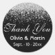 Estos modernos stickers de boda tienen un toque de purpurina plateado sobre un fondo negro. Puede personalizarlo haciendo clic en el menú personalizar. Forma parte de una lujosa suite boda con menú a juego, tarjetas de presentación y muchos más elementos básicos.