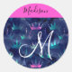 Rompecabezas crujientes y brillantes rosa, morado, turquesa acuática, verde y azul purpurina chispas coronas/ tiaras nombre monograma de princesa de sirena y pegatina redondo clásico inicial. Su nombre personalizado está escrito en negro con un fondo rosado caliente, y su monograma personalizado está escrito en blanco con un elegante guión con letras a mano. ¡Un regalo perfecto de cumpleaños o Navidades!