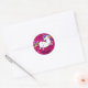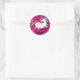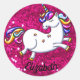 Un lindo pegatina de unicornio arcoiris con un pequeño túmulo de unicornio con una forma de arcoiris y una historia, saltando al aire sobre una cama de purpurina rosa. Tiene cascos de oro, un cuerno de arco iris y estrellas de oro en su cuerpo. El nombre se puede personalizar fácilmente debajo. ¡Genial para los fiestas de unicornio!
