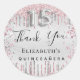 Moderno, elegante y glamuroso para un chica Quinceañera, 15 cumpleaños. Un fondo falso plateado, decorado con polvo rosa y falso purpurina plateado. Con el texto: Gracias. Personalizar y un nombre. El número 15 se escribe con un tipo de letra, guión.