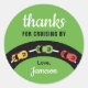 Colorido pegatina de la fiesta de cumpleaños de los autos de carreras en una pista circular negra. El texto dice "gracias por el crucero". Todo el texto es personalizable.