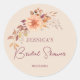 Pegatinas Redondas Clásicas de Recuerdos de Despedida de Soltera Bohemio de Otoño Floral. Con un vibrante ramo de follaje y flores de otoño en tonos cálidos de naranja, marrón, burdeos y amarillo sobre un fondo naranja claro cálido, estas pegatinas celebran a la futura novia con estilo. Dado que todo el texto es editable, estas pegatinas también se pueden utilizar para otras ocasiones, como baby showers.