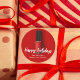 Moda roja Feliz Festividad pegatina para un salón de belleza. Hermosa botella personalizada de esmalte de uñas pegatinas navideñas con tu nombre manicurista y negocio de spa debajo.