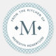 Regalo de comida casera de la cocina de la Verde azulada Gingham Monograma Comida clásica redonda Pegatina o etiqueta de la tapa de jabón... Un verde azulado patrón de chequeo de gingham bordea el texto de su producto alimenticio casero en estas coloridas etiquetas redondas de pegatina para regalar sus mermeladas caseras, galletas, pasteles, panes y más. En el centro de la etiqueta hay dos formas de diamante que bordean el primer monograma. Puede revisar todo el texto para adaptarlo a sus propias necesidades en la práctica plantilla de personalización.