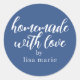La etiqueta personalizada rústica y moderna hecha a mano con amor presenta una elegante caligrafía manuscrita estilizada sobre un fondo azul clásico. ¡Perfecto para todos tus regalos caseros! Simplemente agrega tu nombre a la etiqueta. ¡Diseñado exclusivamente para ti por Happy Dolphin Studio!