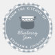 Regalo de comida casera de la cocina de la cocina de la Pegatina azul turquesa o de la etiqueta de la tapa de jabón... Un polvoriento patrón de comprobación de mantas de búfalo azules y blancas bordea el texto de su producto alimenticio casero en estas etiquetas redondas de pegatina para regalar sus mermeladas, conservas y rizos caseros. En el centro de la etiqueta se encuentra un gráfico de frasco de mermelada azul polvoriento oscuro con un texto blanco "de la cocina de" sobre el nombre del producto y el nombre del cocinero. Puede revisar todo el texto para adaptarlo a sus propias necesidades en la práctica plantilla de personalización.