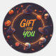 Añade un toque espeluznante a tus regalos de Halloween con este pegatina redondo clásico "Regalo por ti". Con letras atrevidas y elementos espeluznantes de Halloween como murciélagos, calabazas y telarañas, este pegatina es perfecto para sellar favores de fiesta, bolsos de truco o truco o cajas de regalos espeluznantes. ¡Haz que tus dulces de Halloween sean especiales con este diseño festivo y divertido!
