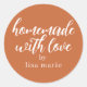 Pegatina personalizada rústica y moderna hecha a mano con amor que presenta una caligrafía estilizada y manuscrita sobre un fondo de naranja quemada. ¡Perfecto para todos tus regalos caseros! Simplemente añade tu nombre a la etiqueta. ¡Diseñado exclusivamente para ti por Happy Dolphin Studio!