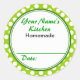 Estos pegatinas de enlatado redondos personalizados caben sobre tu mermelada de vidrio, gelatina y conserva las tapas de tarros. También puede utilizarlos para sellar las bolsas de sus copas, galletas y pan. Tienen una imagen de un patrón de polka verde en la frontera. Puede cambiar el color de fondo si lo desea. Los cuellos de la tapa de la jarra de latas dicen, "Su nombre es cocina casera" y usted puede agregar su nombre en la plantilla para personalizar. Hay una línea para el producto que has hecho, que puedes escribir más tarde. Los pegatinas también dicen, "Fecha", y puedes escribir en la fecha de enlatamiento más tarde. Puede cambiar el tipo de letra, el estilo o el color a personalizar. Añada estas etiquetas de enlatado personalizado a sus encurtidos caseros, deleite, mermeladas, mermeladas, gelatinas y otros regalos de cocina. Hacen grandes regalos personalizados para los amantes de la cocina o los cocineros. Pueden ponerlos en bolsas de brownies, bares y otros objetos para complementar una presentación perfecta. Más añada tu nombre de pegatinas de cocina en el lápiz de Alina.