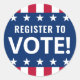 Pegatina con el texto "registrarse para votar" y rayas las fronteras.