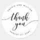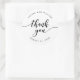 Pegatina de agradecimiento versátil que presenta las palabras "Gracias" en una escritura cursiva relajada en negro sobre un fondo blanco que es perfecto para bodas o varios eventos como despedidas de soltera, baby showers, etc.