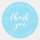 Gracias pegatina que presenta las palabras "gracias" en un libreto cursivo relajante en blanco contra un fondo azul pastel. Personalízalo reemplazando el texto del marcador de posición. Para obtener más opciones como cambiar el tipo de letra y su tamaño/color, expanda la curva /contract o el espaciado entre letras haga clic en el botón "Personalizar". *Tenga en cuenta que la marca de agua Zazzle que aparece en la vista previa del zoom NO aparecerá en el producto impreso final. © Rosewood y Citrus