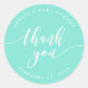 Gracias pegatina que presenta las palabras "gracias" en un libreto cursivo relajante en blanco contra un fondo de menta pastel. Personalízalo reemplazando el texto del marcador de posición. Para obtener más opciones como cambiar el tipo de letra y su tamaño/color, expanda la curva /contract o el espaciado entre letras haga clic en el botón "Personalizar". *Tenga en cuenta que la marca de agua Zazzle que aparece en la vista previa del zoom NO aparecerá en el producto impreso final. © Rosewood y Citrus