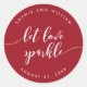 Pegatina de favores de bodas con las palabras "let love sparkle" en un guión cursivo relajante en blanco contra un color de fondo editable (haga clic en personalizar para acceder). Personalízalo reemplazando el texto del marcador de posición. Para obtener más opciones como cambiar el tipo de letra y su tamaño/color, expanda la curva /contract o el espaciado entre letras haga clic en el botón "Personalizar". *Tenga en cuenta que la marca de agua Zazzle que aparece en la vista previa del zoom NO aparecerá en el producto impreso final. © Rosewood y Citrus