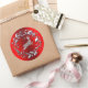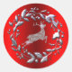 Una pegatina roja de Navidad muy elegante con un reno plateado brillante saltando a través de un fondo rojo metálico, dentro de una corona de Navidades plateados. Este magnífico pegatina rojo y plateado le dará un toque elegante y lujoso a sus decoraciones navideñas de este año.