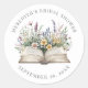 Un diseño redondo dulce y elegante inspirado en el tema "Un nuevo capítulo comienza", perfecto para una despedida de soltera. En el centro del diseño hay un libro abierto de acuarela con flores silvestres y vegetación que se derraman, con tonos suaves de rosa, amarillo, azul y púrpura para un aspecto ligero y alegre.