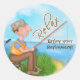Pegatina con fondo de cielo azul, con fondo de paisaje de lago y hierba y hombre sentado en un tronco con su barra de pescar, caja de abordaje y cebo. El texto dice Relájate, disfruta de tu jubilación.