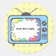 Pegatina de fondo amarillo claro con pequeños puntos de polka verde claro. El televisor azul de inspiración retro incluye una pantalla de prueba y antenas de oído de conejo. Personaliza con tu nombre u otro texto de tu elección. Buscar elementos coincidentes en el paquete de Jill.