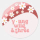¡Jóvenes Salvajes y Tres! Pegatinas de la tercera fiesta de cumpleaños inspirados en Retro con daisies de estilo de los años 70 y fuentes y colores boho.