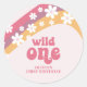 Pegatina de invitación de cumpleaños Wild One inspirado en el retro con dádivas de estilo 70 y fuentes y colores boho.