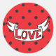 Pegatinas de puntos de polka rojos y negros, con un gran pergamino que dice AMOR. Ideal para publicar el diseño de fondo Guardar la fecha.