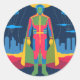 Pegatina Redonda Retro Sci-Fi Hero Over Cityscape