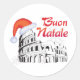 Diseño de vacaciones Buon Natale y Natale italiano con una foto del Coliseo Romano usando un gorra de Santa Claus con nieve cayendo.