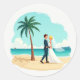 Incluye 20 pegatinas pequeñas en una hoja. Adorable ilustración de una pareja con ropa de novios compartiendo un momento romántico en una playa de arena con una palmera y un océano azul claro en el fondo.