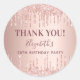 Un pegatina para una fiesta de cumpleaños número 50 (o de cualquier edad) glamurosa y femenina. Fondo de gradiente dorado subió con goteo, pinturas con aspecto de goteo. El texto: Gracias. Personaliza y agrega nombre y edad 50. El nombre está escrito con una escritura de estilo con letras a mano moderna.