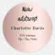 Hemos movido la etiqueta de la dirección de retorno. Personaliza y agrega tu nombre y nueva dirección. Un fondo dorado rosa.