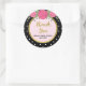 Elegante pegatinas redondos de Gracias con falsos bordes dorados, puntos de polka en blanco y negro y rosas rosas rosas. Utilícelo para sellar los sobres, los bolsos de bienvenida o la decoración. Consulta la invitación a ducha de novia coincidente en mi tienda aquí -> http://www.zazzle.com/black_white_stripes_roses_bridal_shower_invitation-256841483832769937?rf=238364477188679314 Personalízalo con tus detalles reemplazando el texto del marcador de posición. Para obtener más opciones, haga clic en el botón "Personalizar". *Tenga en cuenta que la marca de agua Zazzle que aparece en la vista previa del zoom NO aparecerá en el producto impreso final. © Rosewood y Citrus