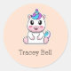 Un unicornio blanco y suave con cuerno azul y púrpura sobre fondo rosado. Sólo hay que añadir un nombre a este diseño.