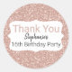 Rosa purpurina de oro cumpleaños gracias pegatina. El diseño presenta un fondo rosa purpurina de oro y el texto "Gracias" en purpurina rosa de oro. Además, su nombre personalizado.